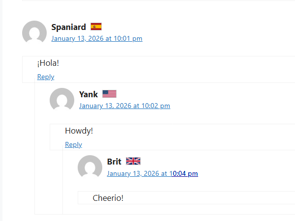 One limitation is that the Country selection and flag display are not available to logged-in users. Since such users’ metadata (name and email) are handled internally by WordPress, it was decided that support for the Country field in this case would be unduly complex. The logged-in user would just need to log out, then revisit the blog to make their flag selection.