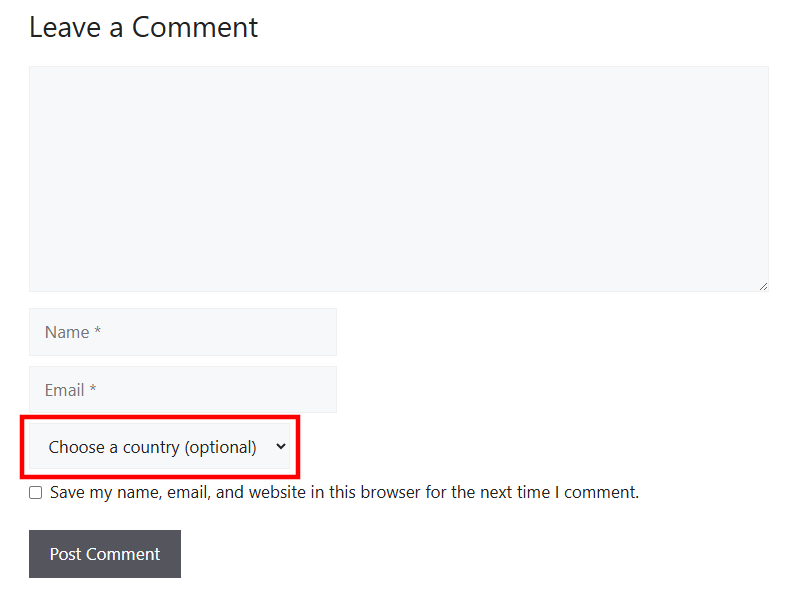 The Aquiline Comment Country Flags plugin affords a commenter on a GeneratePress blog the option to affix a country flag to the right of their name in the comment header. A new, optional field is added below the existing fields in the Comment submit form. The commenter is presented with an alphabetical list of the countries which the site administrator has enabled in the plugin settings panel.